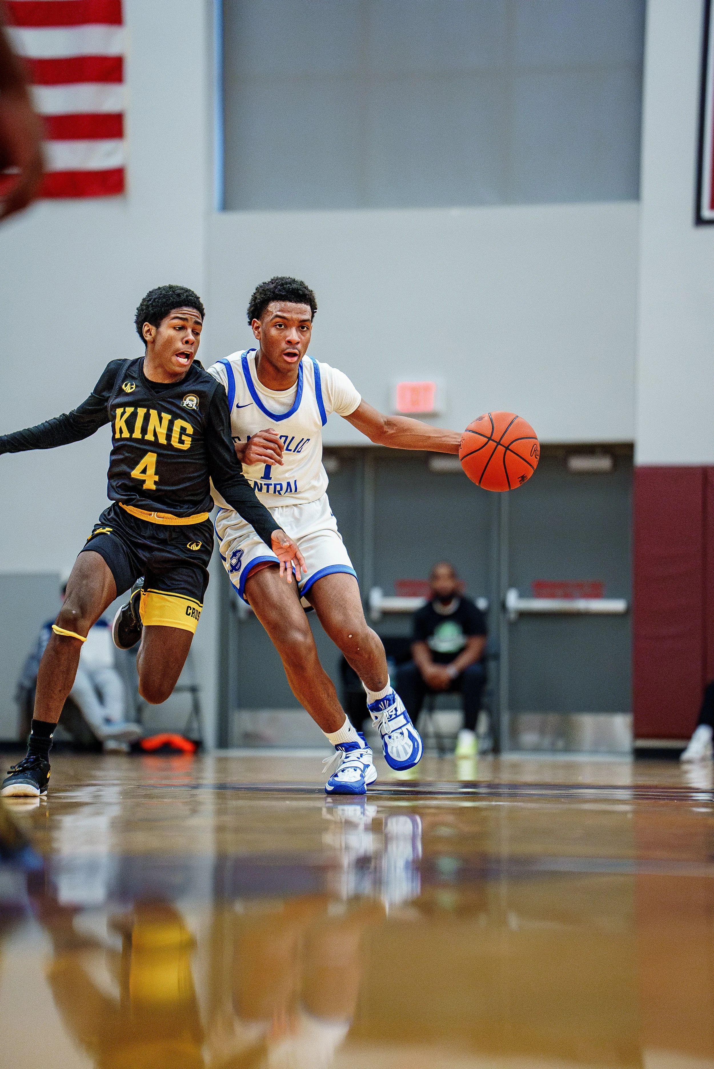 Grand Rapids Catholic Central senior Jordan McCoy (1) against Detroit King at the 2K25 Showcase in Grand Rapids, Michigan on Saturday, Jan 25 , 2025 (Jake Szetela)